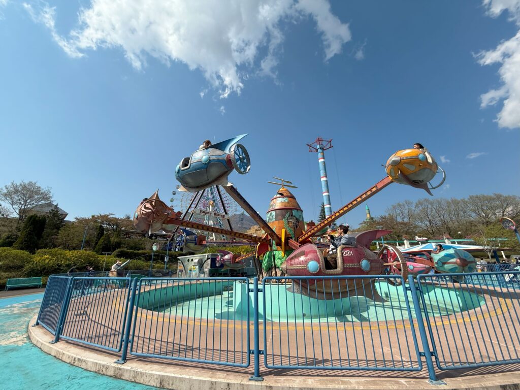 座席の操作バーで上昇下降を操作できる回転アトラクション。ウーピーから発射される水を自分の意思で避けたり当たりに行ったりできるので、人によってはびしょ濡れに。親子で操作バーの取り合いになることも(笑)暑い日は気持ちいいですよ。